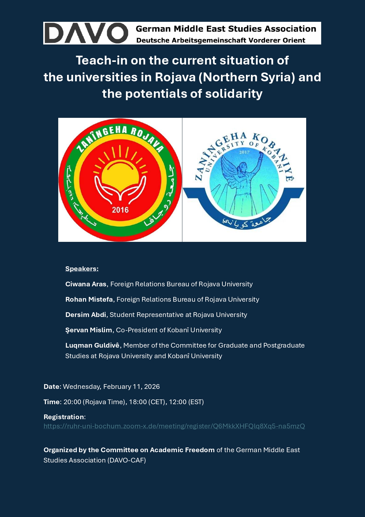 Like many of you, we’re following developments in Rojava/Northern and Eastern Syria. To better understand the situation and in response to the call for support and solidarity from faculty and students of the three universities in Rojava, we are organizing a teach-in and information event with representatives of faculty and students from the universities in Rojava on February 11 at 18:00 (CET) via Zoom.